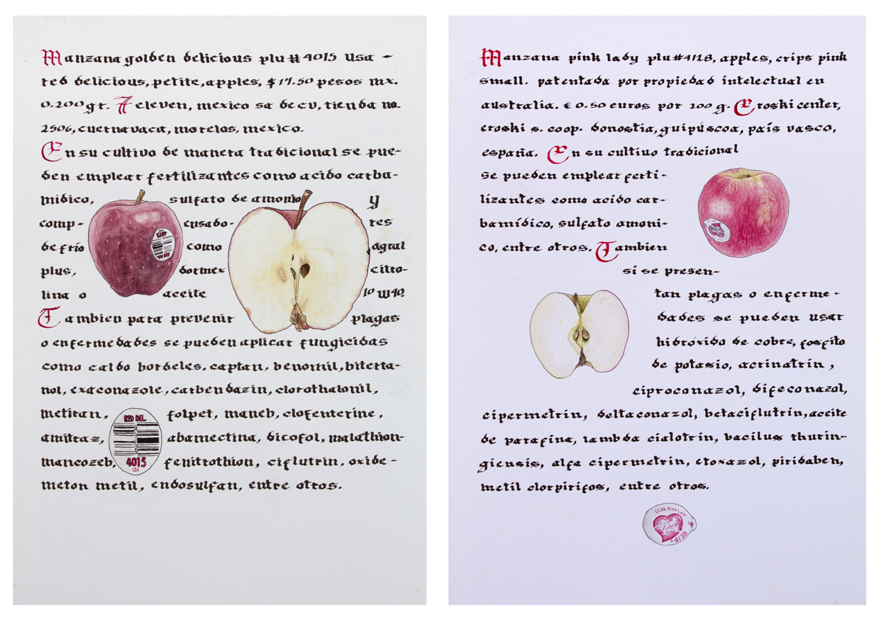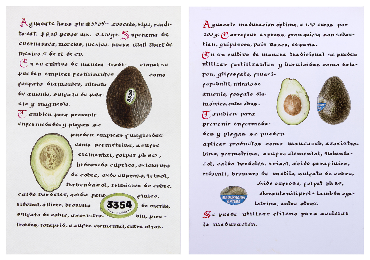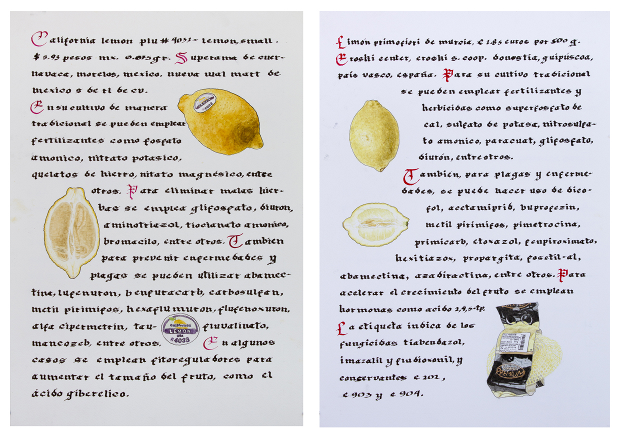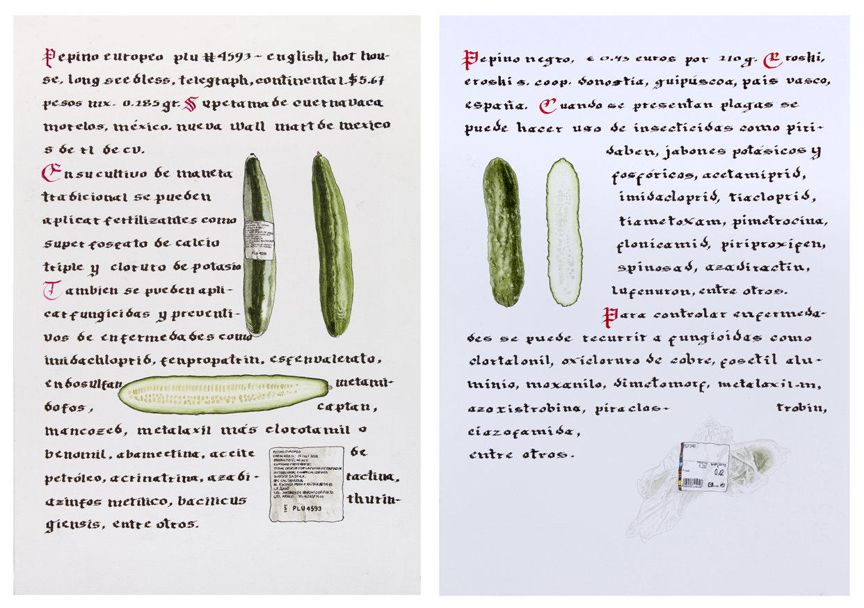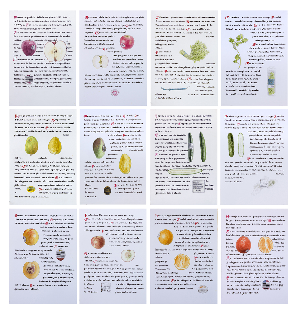 //Record of vegetables and fruits from the supermarket, both in Mexico and Spain, using the format of the medieval herbarium. It is a compendium of our current relationship with food: on the counter, through labels, packaging or commercial codes, the globalized supply of food, as well as the chemicals used in agribusiness.