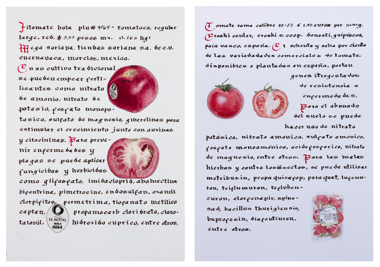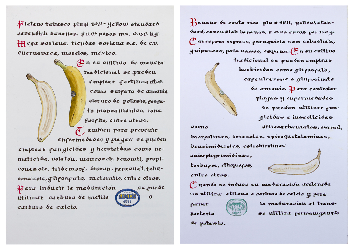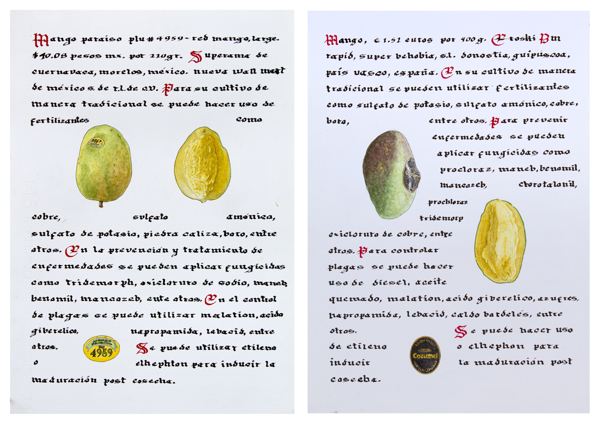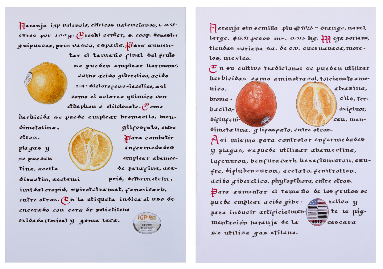 //Record of vegetables and fruits from the supermarket, both in Mexico and Spain, using the format of the medieval herbarium. It is a compendium of our current relationship with food: on the counter, through labels, packaging or commercial codes, the globalized supply of food, as well as the chemicals used in agribusiness.