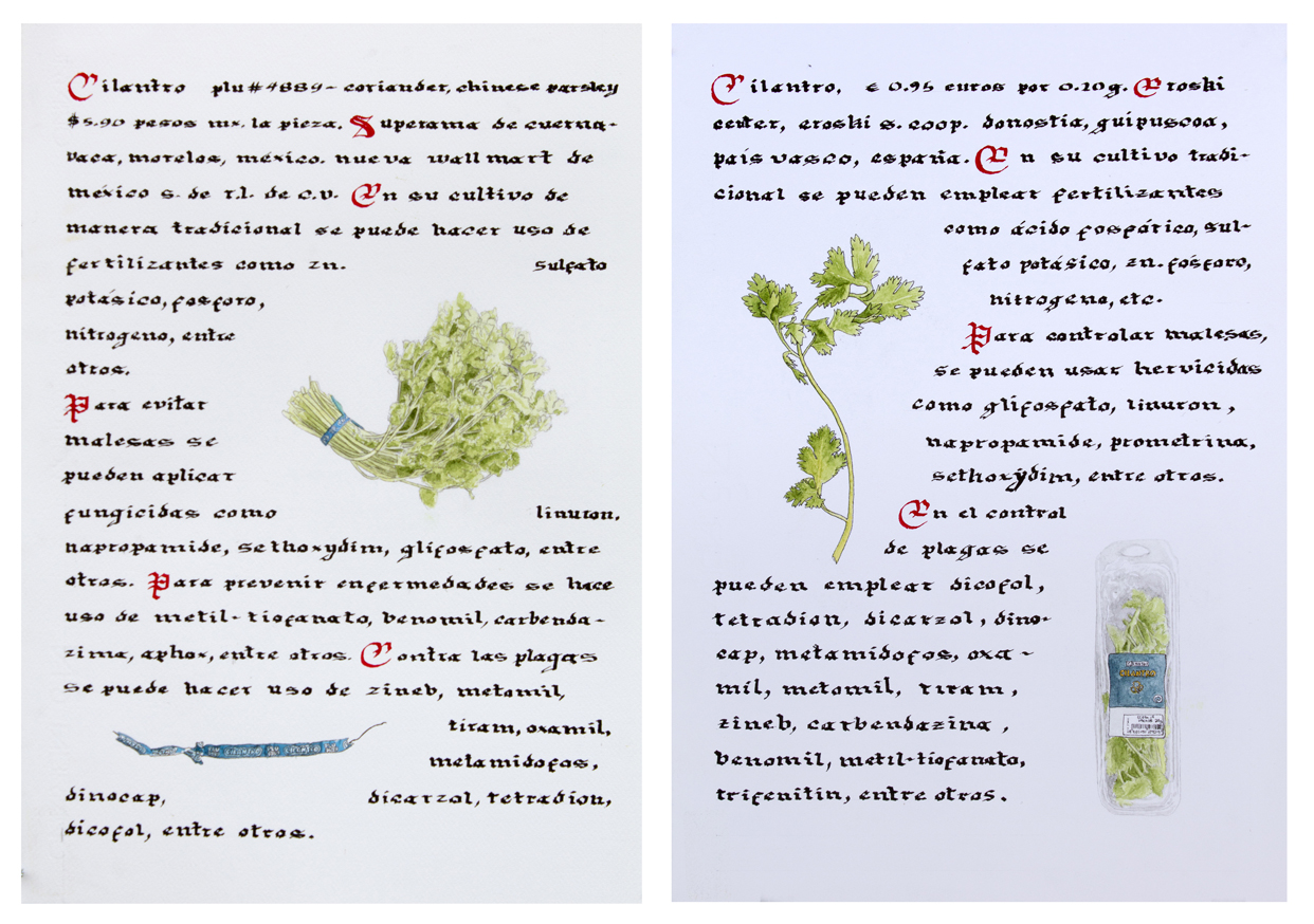 Registro de verduras y frutas del supermercado, tanto en México como en España, utilizando el formato del herbario medieval. Es un compendio de nuestra relación actual con los alimentos: en mostradores, a través de etiquetas, empaques o códigos comerciales, la oferta globalizada de los alimentos, así como los químicos utilizados en la agroindustria.