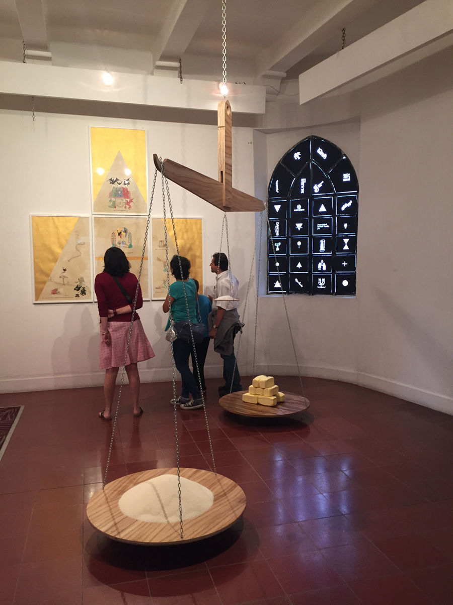 Trinidad de la obesidad. Exhibition view in TABAKALERA, Donostia, Vasque Country. 2018. Este conjunto de piezas se basa en un manuscrito alquímico del siglo XV: Das Buch von der Heiligen Dreifaltigkeit (El libro de la santísima trinidad), que describe el lapis alquímico a partir de una analogía con la resurrección de Cristo y la trinidad. Partiendo de esta analogía, la obra de Garcilazo representa la piedra filosofal de la comida procesada: el equilibrio ideal entre la grasa-azucar-sal, combinación altamente adictiva, esta trinidad de ingredientes es ampliamente utilizada en la industria alimentaria.