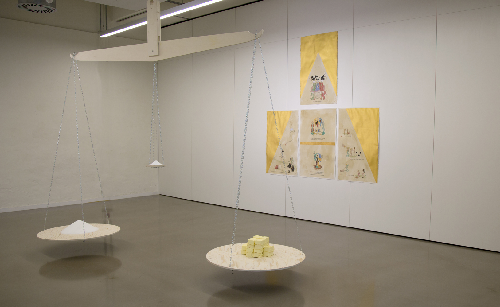 //Trinity of obesity. Exhibition view in TABAKALERA, Donostia, Basque Country. 2018. This set of pieces is based on a 15th century alchemical manuscript: Das Buch von der Heiligen Dreifaltigkeit (The Book of the Holy Trinity), which describes the alchemical lapis from an analogy with the resurrection of Christ and the trinity. Based on this analogy, Garcilazo's work represents the philosopher's stone of processed food: the ideal balance between fat-sugar-salt, a highly addictive combination, this trinity of ingredients is widely used in the food industry.