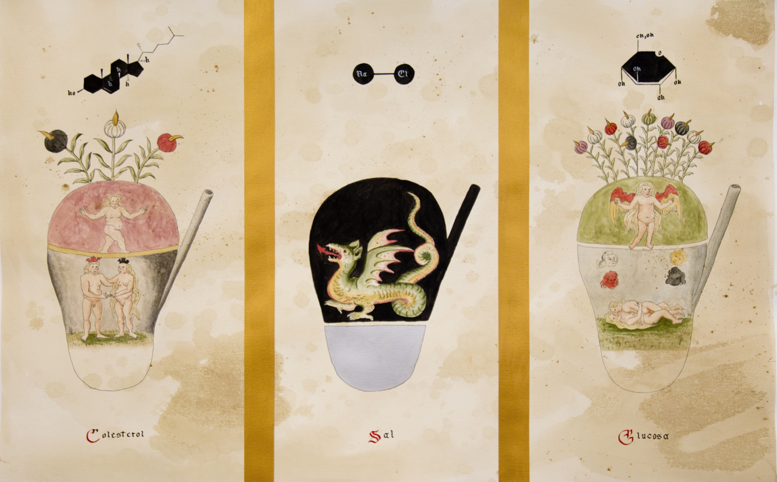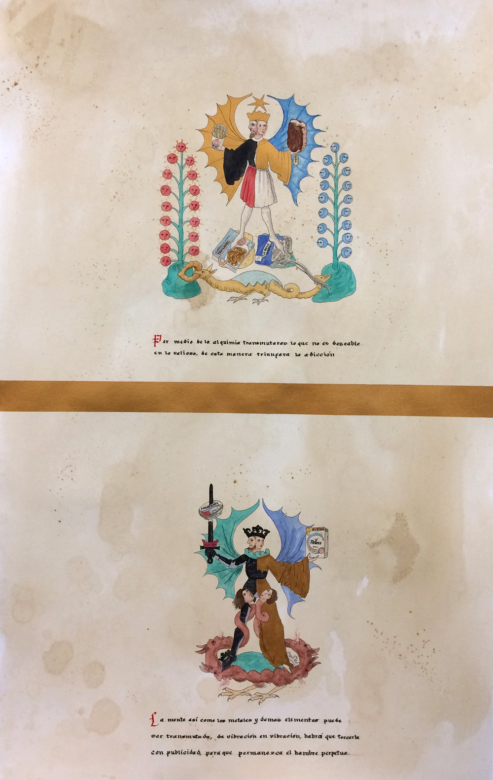 The main axis of this project is the relationship of the diet imposed by consumption in supermarkets, the standardization of products and agro-industry, ading some Alchemical secrets to achieve an addictive consumption and a rampant diet. This emerge from a visual record in a medieval herbarium format, made in supermarkets in Cuernavaca, Mexico and Donostia in the Basque Country.